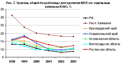 Показатели безработицы в Ростовской области хуже средних по стране с середины 1990-х годов (рис. 7). Рынок труда области болезненно пережил дефолт, а в период роста экономики улучшение шло медленней, чем у всех "русских" регионов-соседей. В 2003 г. в области, как и во многих регионах страны, вновь начался рост безработицы. Одна из причин более проблемной ситуации на рынке труда – сохраняющееся депрессивное состояние угольных городов, а также судостроительного Азова. Отчасти это подтверждают показатели зарегистрированной безработицы, максимальные в шахтерских городах Шахты, Зверево, Белая Калитва, а также в городе Красный Сулин. Численность зарегистрированных безработных за 2000—2002 гг. выросла в этих городах в 1,5—2,5 раза.