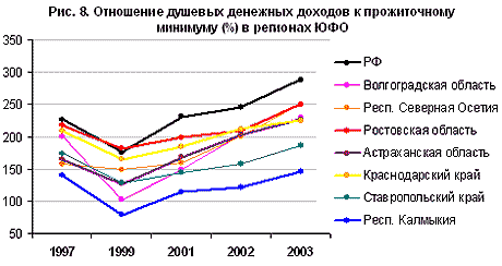 В отличие от показателей занятости, индикаторы доходов населения области более благополучны. По сравнению с другими регионами Юга Ростовская область в 1990-е годы имела более высокие душевые доходы (с учетом стоимости жизни) и не испытывала такого сильного спада доходов в период дефолта (рис. 8). В первые годы экономического подъема рост доходов населения области был медленнее среднероссийского. Однако в 2003 г. область приблизилась к относительно благополучным субъектам РФ, душевые доходы ее населения превысили прожиточный минимум в 2,5 раза. Понимая относительную достоверность учета доходов, все же отметим, что Ростовская область постепенно восстанавливает позиции лидера по уровню жизни на юге страны.