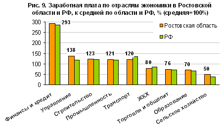 Рис. 9. Заработная плата по отраслям экономики в Ростовской области и РФ, к средней по области и РФ
