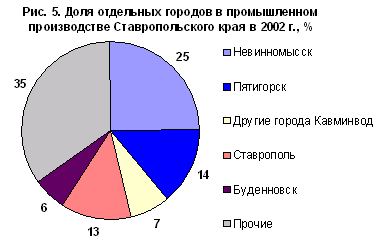 Рис. 5. Доля отдельных городов в промышленном производстве Ставропольского края в 2002 г.