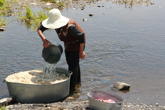 действующего водопровода в селе нет, женщина моет шерсть в реке: