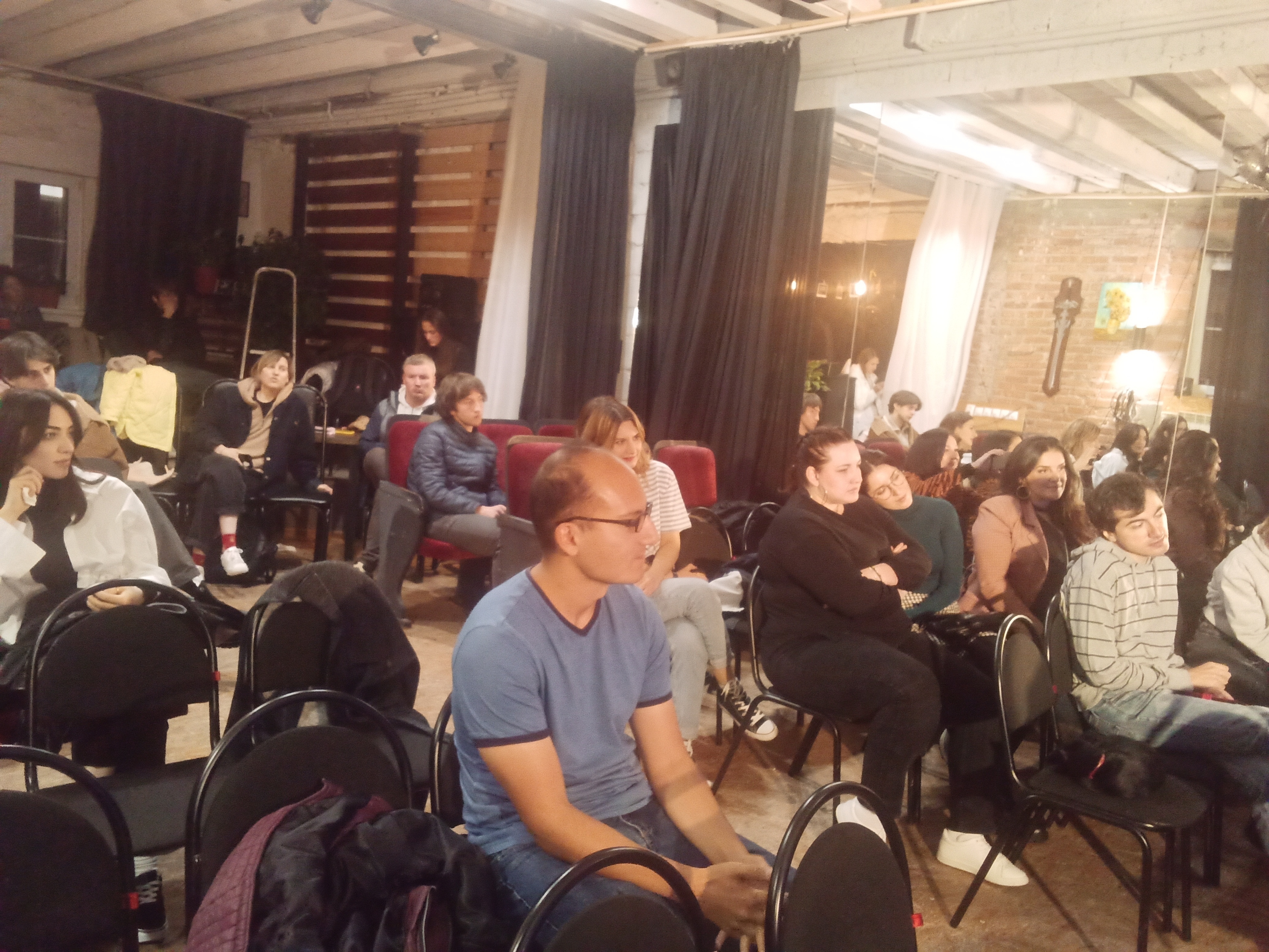 на первом фото режиссер Тамерлан Васильев и организатор владикавказской синематеки Анна Кабисова. на втором зал посетители синематеки.