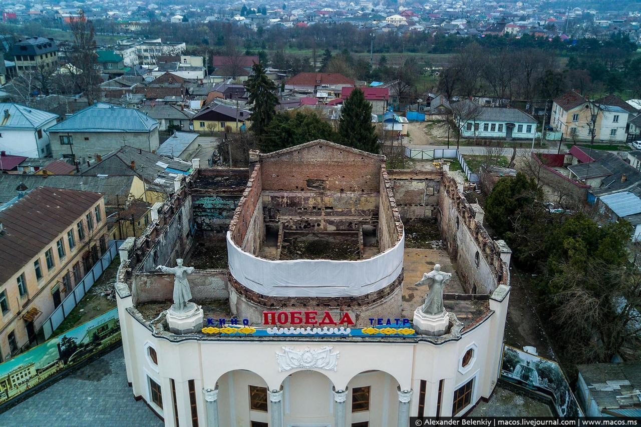а судьба него незавидная. "Победа" это первый профессиональный кинотеатр на территории Кабардино-Балкарии. был построен в 1932-1936 г.г. стиле постконструктивизма. красивый фасад венчает пара танцовщиков в национальной одежде. думаю, что в середине 30-х это здание вызывало сильный воторг у жителей Нальчика. в начале кинотеатр назывался "Зимний". во время ВОВ в него попала авиабомба, которая почти полностью разрушила здание, но фасад уцелел. сразу после деоккупации Нальчика от фашистов кинотеатр начали восстанавливать и за два года его полностью восстановили. в 1944 году тут вновь показывали фильмы. ну а потом развалился Союз со всеми последствиями... до 2007 года кинотеатр работал, потом закрылся и начал простаивать. нальчане много раз пытались призвать власти к тому, чтобы заняться этой проблемой, но безуспешно. а в 2017 году, как это часто бывает с такими зданиями, случился пожар. один из героев фильма недвусмысленно намекает, что это был поджог, ибо здание горело полностью, с четырех сторон.