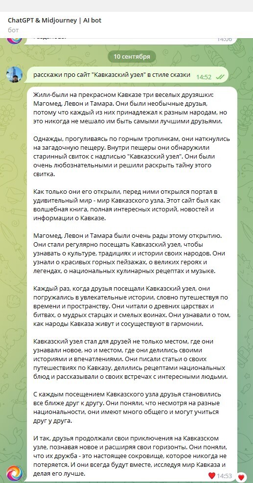 подумав об этом, я сделал запрос в GPT, попросил первое что пришло в голову. и, честно говоря, был очень впечатлен творческим ответом. она меня прям растрогала) читайте сами, это сказка о "Кавказском узле". нейросеть явно в теме!