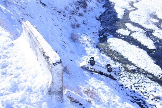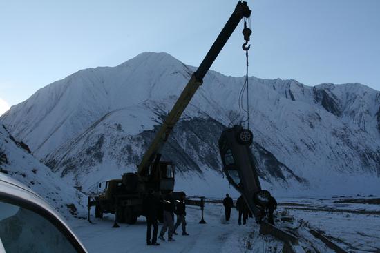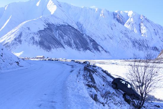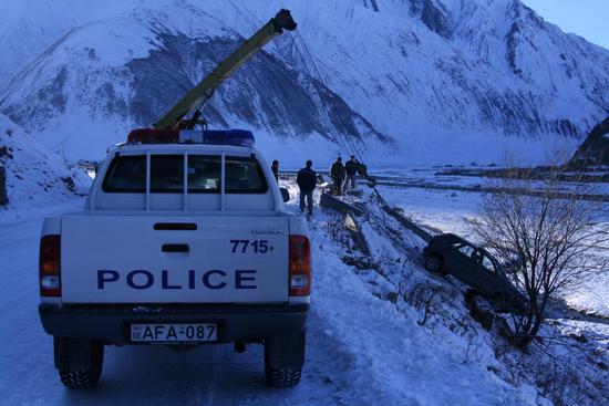 на следующий день погода прояснилась и мы пораньше двинулись в путь. умудренные опытом решили одеть цепи там, где уже не сможем подняться. но дорожные службы расчистили завалы и посыпали утрамбованный снег землей. это значительно упрощало движение и мы довольно уверенно забрались на перевал (высота 2400 км), любуясь горными красотами. приободренные, мы стали спускаться, опять же без цепей, за что и были наказаны. мы уже проехали все опасные спуски, и посчитав, что все опасное позади, забывшись, совсем немного прибавили скорость, может до 50 км/ч. как только проехали Коби, на одном поворотов машину просто повело вперед без всяких шансов на то, чтобы вырулить или тормозить. метров 20 до оврага мы ехали как на санках. почему не выпрыгнули до сих пор не могу понять. вроде по дороге сто раз друг другу сказали, если что - прыгаем, отстегнули ремни специально, но когда эта ситуация случилась - замерли. что за психология такая, до последнего не веришь, что вылетишь в овраг...