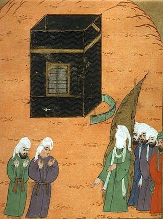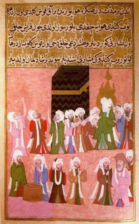 Мухаммад, молящийся возле Каабы в Мекке. От  Siyer-i Nebi, турецкий текст о Мухаммаде, написанный  Mustafa, son of Yusef of Erzurum. Иллюстрация времен Мурада  III.1595. Музей Топкапы. Стамбул. Турция.
