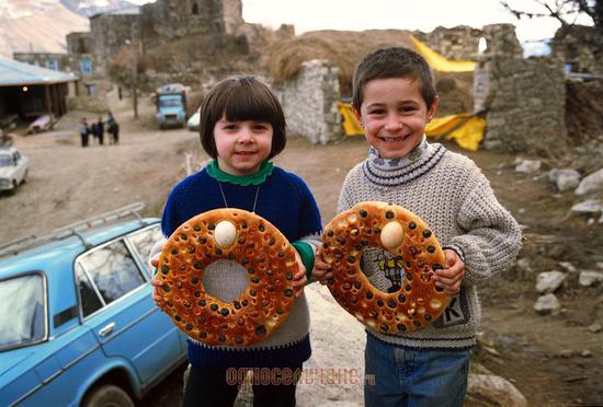 Хлеб выпекался в зооморфной форме — пекли лошадей, быков, баранов, зайцев, куропаток, голубей, петухов, куриц, гусей; в антропоморфной форме — т.е. в форме человека и в виде хлебов-баранок. В тесто обрядовых антропоморфных хлебов втыкали яйца, грецкие орехи, изюм, а вместо "глаз" и "рта" - абрикосовые косточки, черные бобы. В таком виде их запекали в хлебной печи.