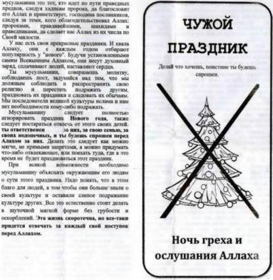Уже в конце 2011 года в Дагестане ряд известных и уважаемых в республике людей заявили, что "не отмечали и не будут отмечать Новый год, исключительно по религиозным мотивам". В декабре 2010 года в Хасавюрте силовики задержали студента одного из исламских вузов, который распространял буклеты с просьбой не праздновать Новый год. Священнослужители в Дагестане также призывали мусульман не отмечать начало нового года, так как это светский праздник.