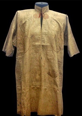 Скроенная из хлопчатобумажной ткани  как туника без плечевых швов, с круглой горловиной, воротником-стойкой, рубаха с лицевой стороны и по спине почти вся покрыта древними письменами и кругами. По окружности кругов вписаны тексты и цифры.