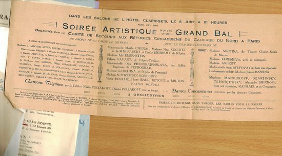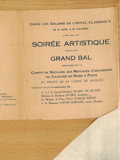На этот раз Маирбек предоставил для публикации еще один интересный документ из своего архива – объявление о вечере в отеле Кларидж, организованном Comite de Secours des Refugies Circassiens du Caucase du Nord a Paris, т.е. Комитетом помощи черкесским беженцам с Кавказа.