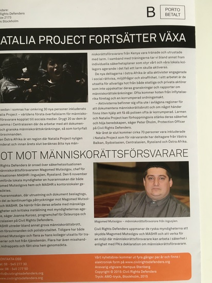 Это не молодая взрослая женщина искренне не понимала проявленную в отношении неё и ее спутников, агрессию и жестокость, я бы сказал, что она на момент нашей встречи все еще находилась в шоке от пережитого. Признаюсь, я чувствовал себя очень не уютно, не смотря на то, что я довольно коммуникабельный и общительный человек, к тому же к произошедшему не имею ни какого отношения, но мне было стыдно перед этой женщиной за оказанное падлецами им «гостеприимство», на нашей вайнахской земле. Увидев подходящую к нам женщину с костылем, я сразу же узнал ее еще до того, как коллеги нас представили друг другу, мне стало неловко, но я все же попытался объяснить неестественность произошедшего с ними, для нашего менталитета.  Лена Мария оказалось очень тактичной женщиной, я не услышал от нее ни возмущения, ни критичных высказываний, она была лишь немного взволнована. Немного пообщавшись с ней, я потихоньку оставил ее наедине с другими коллегами, а сам пошел в их офис, где на столе увидел журнал, в котором на шведском языке были описаны события, произошедшие 6 ноября 2015 года в моем доме и офисе, об изъятии документов и техники, о подлых и необоснованных обвинениях.