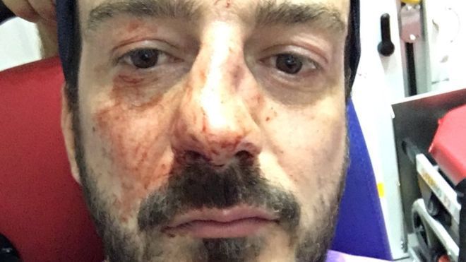 Мелани говорит, что выходил из ресторана в центре города, когда на него напали. В результате избиения у Мелани сломан нос.