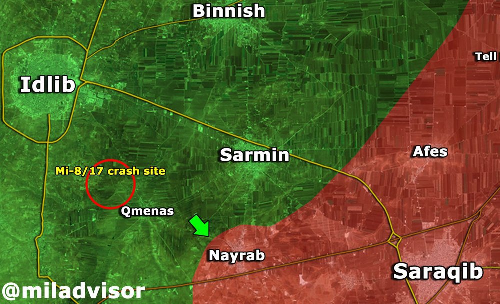 Красным обозначены территории в Идлибе,  втч, Найраб,  взятые под контроль Сирийской армией. Кружком -  вероятное место, где был сбит сирийский вертолет.