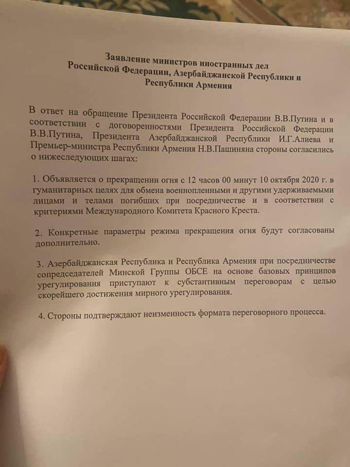 Конечно,  все обратили внимание на вчерашнее заявление Ильхама Алиева, которые было решительным и непримиримым в плане Карабаха. С другой стороны, временно или нет, но, перемирие -  достигнуто. Вопрос о худом мире и доброй ссоре, как был спорным, так спорным и остаётся.  Мои материалы от 1 октября:  :Карабах. Правовая коллизия и хороводы вокруг новых переговоров