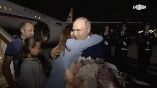 Как следует из видео, опубликованного, в частности, РИА "Новости", бывшие заключенные спускались по красной дорожке, у трапа выстроился почетный караул. Мужчина в кепке и спортивной куртке, похожий на Вадима Красикова, спустился первым и обнялся с Путиным.