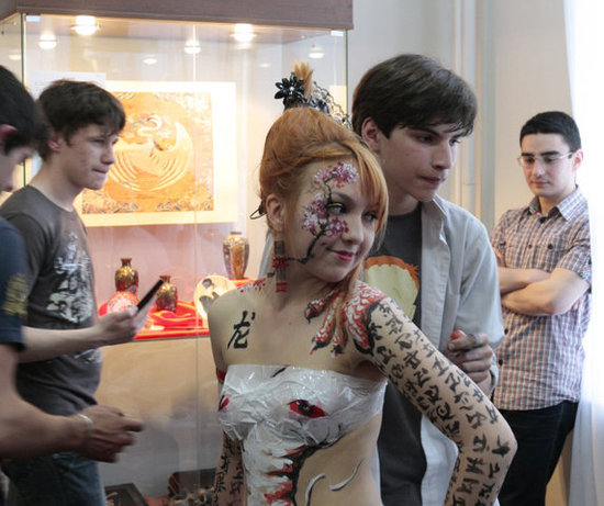 Краеведческий музей стал, пожалуй, самым посещаемым местом в этот вечер, выдав на гора сразу два любопытных события - выставку "Восток - дело тонкое" и акцию молодых художников, которые расписывали руки, шеи, спины, лица всех желающих. Боди-арт, понимаешь.
