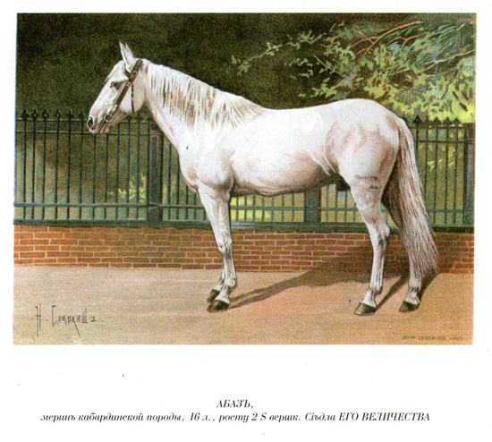 Его описание приводит Хан-Гирей: «Удивительно, с какою неутомимостью и тщанием черкесы содержат верховых лошадей: дважды в году они откармливают своих любимых коней: летом при наступлении жаров и зимою при наступлении стужи. Откармливаемую летом лошадь ставят в конюшню, со тщанием обмазанную глиною и темную, чтобы мухи не беспокоили лошадей, в ней содержимых.
