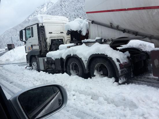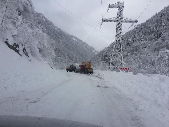 Наконец на горизонте появились и роботники электросетей со своей легко узнаваемой техникой. Радостные они сообщили нам что разрыв устранен,тот  самый что был вдоль трассы. Но проехав еще немного, мы встретили менее воодушевленного работника ГЭС, он то нам и сообщил, что свет вроде подали но до населенных пунктов он не дошел, и что они пробивают дальномером, и что по первоначальным оценкам разрыв там, километрах в 10- 15, и указал в снежную глубину ущелья Дзомагъ.