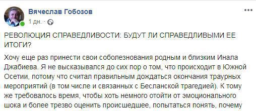Вторым, из экс-депутатов, опубликовал своё видение самой ситуации и выхода из нее Вячеслав Гобозов. И если его коллега по первому парламенту, только в тексте дал оценку ситуации, а именно назвал ее как попытку государственного переворота, то Гобозов с ходу в самом заглавии уже использует термин Революция, правда поясняя что это революция справедливости. И судя по тому что он вопрошает, будут ли справедливыми ее итоги, она, по его мнению уже свершилась.