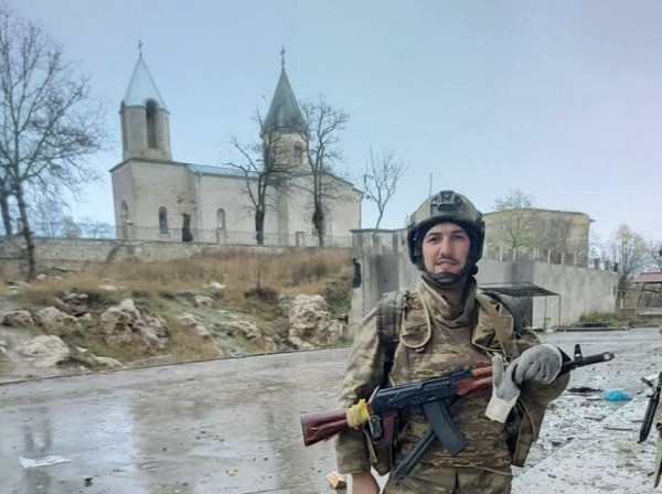 Однако в «Русской планете» и других ресурсах размещена фотография бойца из ЧВК «Вагнера», снявшегося на фоне армянской церкви в Шуше.