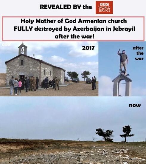 Оставим без комментариев поразительно мерзкую аргументацию авторов сообщения, заверяющих о том, что строительство армянской церкви на азербайджанской земле делает эту территорию навечно армянской. Изгнали местное население, свершили геноцид, этноцид, разрушили полностью все, изменили название и место стало армянским. Вот так они делают свою географию. Жизнь показала другое, известно что...