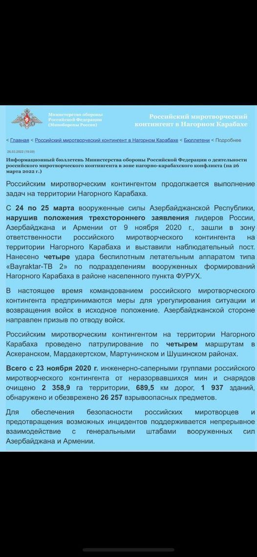 “Министерство обороны Азербайджанской Республики сожалеет об однобоком заявлении Министерства обороны Российской Федерации от 26 марта 2022 года, которое не соответствует действительности.