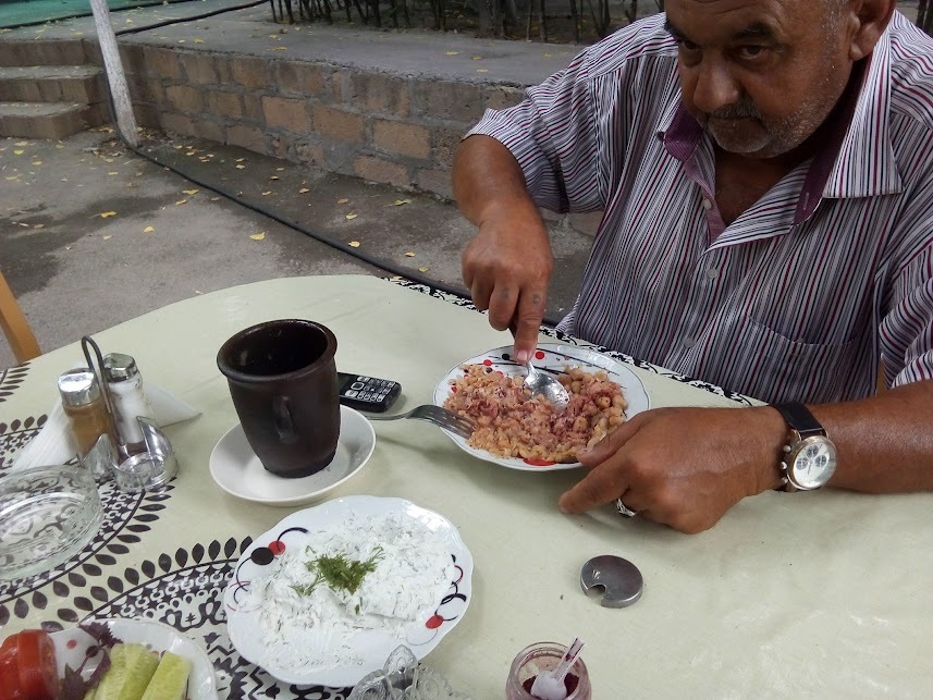 В Шеки сели кушать пити. Быть в Шеки и не откушать местное пити - нельзя, за такое могут из дома выгнать. Шофер советовал место, где вкуснее и дешевле. Про дешевле согласен, но вкус был слабый. Хотя после Баку все сойдет. Ели по правилам шекинцев: сначача из глиняного кувшина в котором приготовлен суп из баранины, курдюка и гороха, выливается в тарелку бульон и поедается с хлебом плюс сырой лук и специя - сумах.