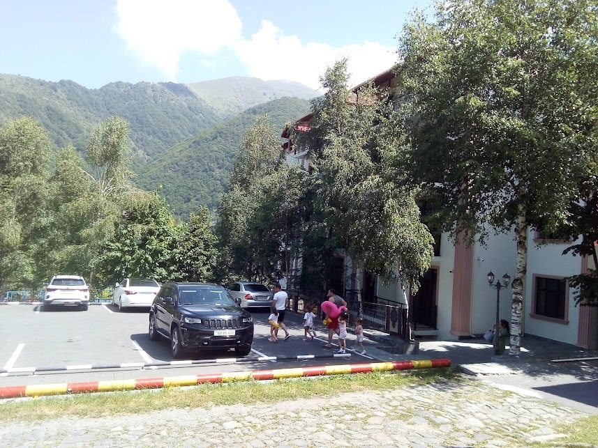 В Илису мы решили отдохнуть за чаем в одном из крупных местных отелей семейного отдыха, не называю чтобы не рекламировать и не антирекламировать. Поверхностный обзор, взгляд в ресторан, бассейн и детские площадки говорит о приближении к уровню турецких аналогичных туробъектов. Но цена в азербайджанских местах отдыха не приближается, а с первого дня их появления перегнала турецкий уровень. День проживания  в азербайджанском туробъекте с едой стоит дороже чем в Турции. При этом ассортимент блюд в столовке в 10 раз меньше. Правда, качество наших блюд настолько же выше.