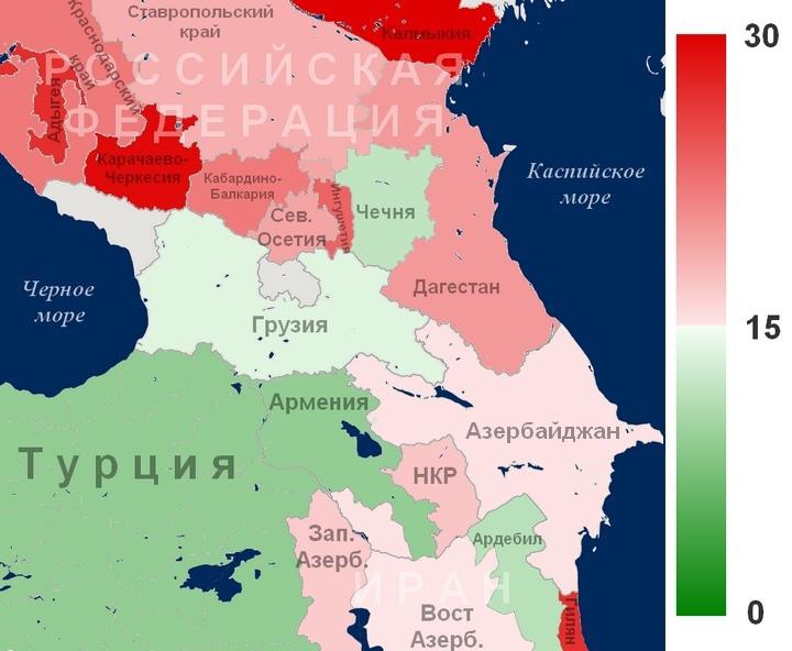 На карте изображено число смертей от дорожно-транспортных происшествий в нашем регионе. Пересчитано это на 100,000 населения, усреднено за последние 3-4 года (в Армении и Грузии - 2014-2017 гг., в Азербайджане, Турции, России - 2013-2016, в Иране - 2012-2014). Усреднение было сделано, чтобы избежать выбросов и слишком сильных статистических отклонений. При пересчете на численность населения использовался альтернативный подсчет численности населения для всех регионов России, а также Южного Кавказа, тогда как для Ирана и Турции - использовались официальные данные о численности населения страны/регионов.