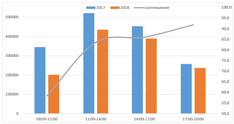 Примечание: по оси слева – количество проголосовавших за каждые три часа, справа – соотношение числа проголосовавших в 2018 году к 2017 году, в процентах