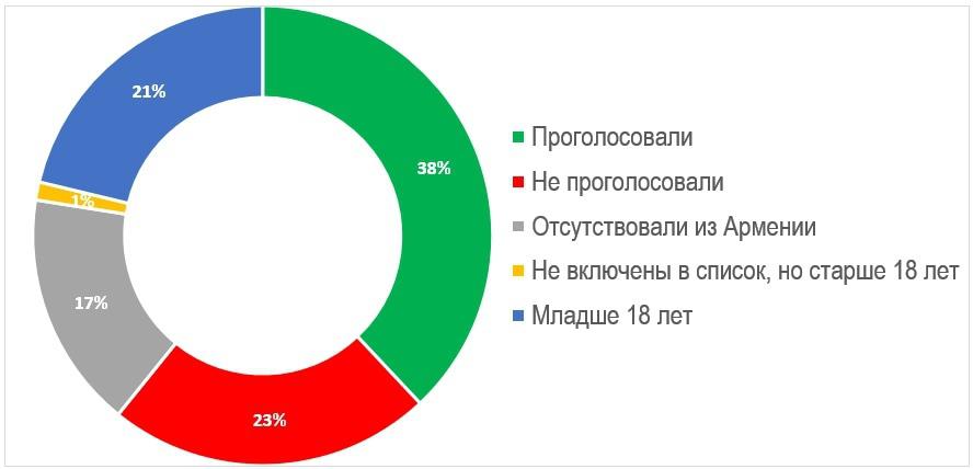 Ориентировочно, на 9 декабря наличное население составляет 2 миллиона 793 тысячи человек, из которых ориентировочно 28 тысяч – не являлись гражданами Армении. Число избирателей в населении Армении составляет примерно 74.5% населения, но лица, не достигшие 21 года, далеко не всегда включены в списки. С 2017 года методология не изменилась, а тогда в основном списке был недобор молодежи. Так происходит и во время переписей, правда там происходит недоучет новорожденных. Учитывая, что в общем числе наличного населения число избирателей составляет 2,060 тыс., причем около 45 тысяч из них не включены в список, наличное число избирателей, состоящих в основном списке, составило около 2,015 тысяч и примерно 2,018 составило бы число избирателей, включая дополнительный список. Таким образом, явка в действительности составила 62.5%, что значительно больше официальных 48.6%.