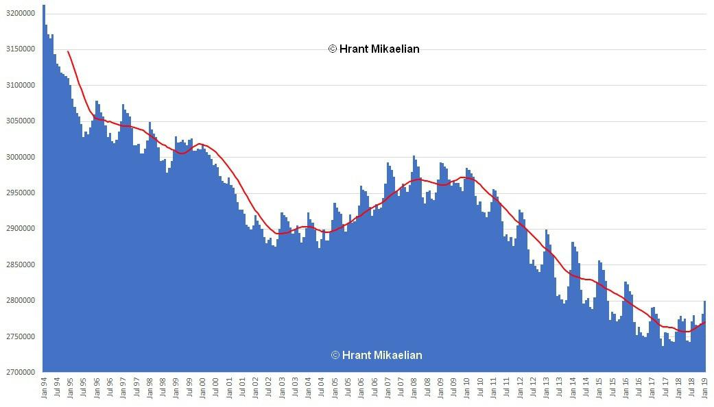 Фактически, после распада СССР официальные органы точной численности населения не знали – и не озвучивали ее. Но демография – наука точная и она дает немало инструментов, чтобы эту численность рассчитать. В последнее время стало очевидно, что метод расчета постоянной численности населения, который используется в Армении, не дает возможности иметь адекватное представление о численности, поэтому я уже давно рассчитываю только наличное население, которое напротив – легко рассчитать. Причем его уже можно рассчитать не только на ежегодной или ежеквартальной основе, как это делают соответственные органы, но и на ежемесячной, что я и делаю: