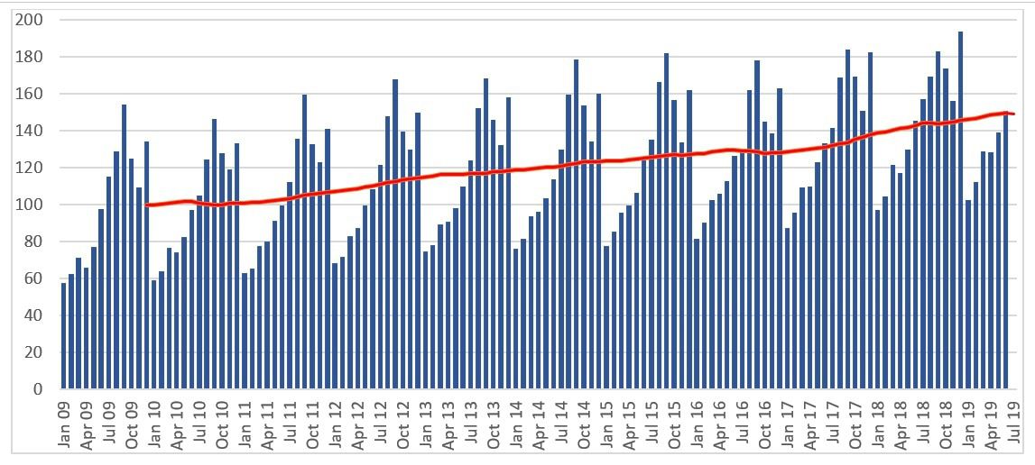 График 1. Динамика показателя экономической активности в Армении, 2009-2019 гг. (ежемесячные значения показателя; среднегодовое за 2009=100)