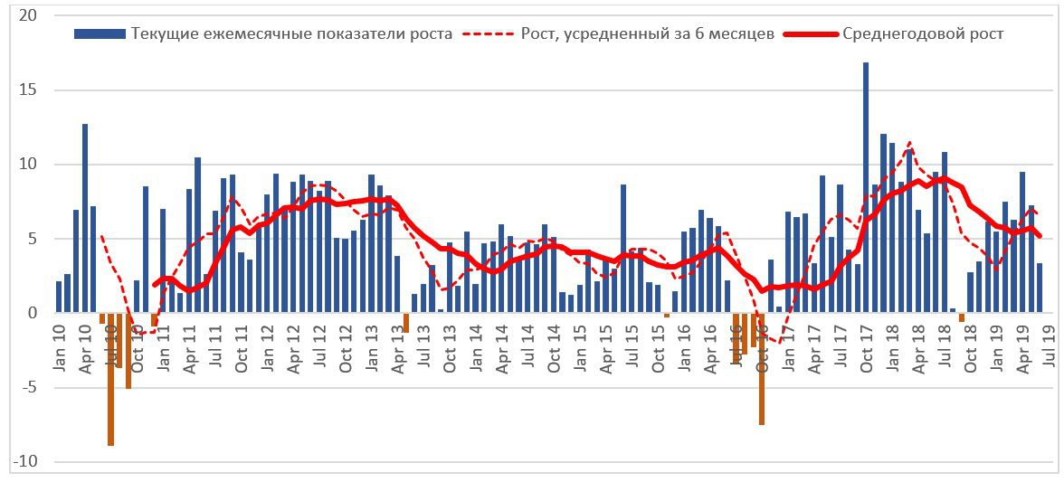 График 2. Динамика роста экономической активности в 2010-2019 гг. (ежемесячные показатели роста к аналогичному месяцу предыдущего года, %)