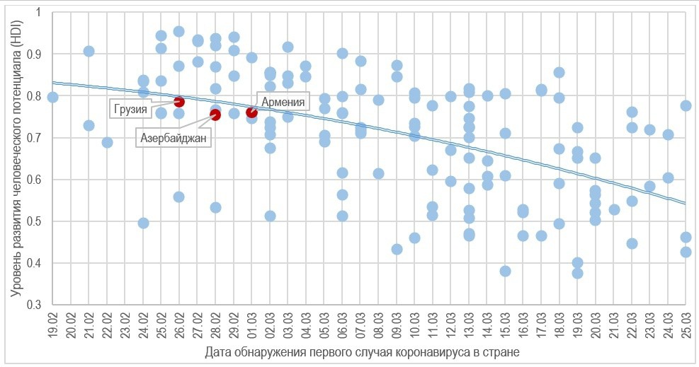 Здесь в первую очередь видно, как после Китая основным очагом стала Европа, а позже – и США. На сегодня это не так. Но чтобы эту связь продемонстрировать более выпукло, можно посмотреть на взаимосвязь уровня развития человеческого потенциала в стране (индекс UNDP) и даты появления коронавируса в стране.