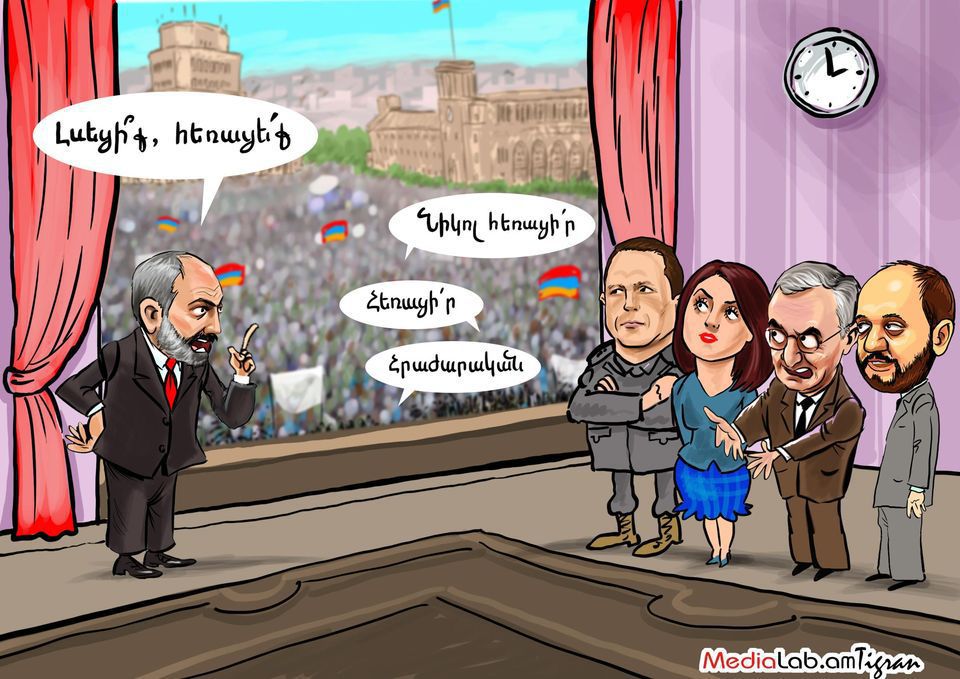 Коллаж от Medialab. На картинке – народ требует отставки Пашиняна, а он отправляет в отставку министров.