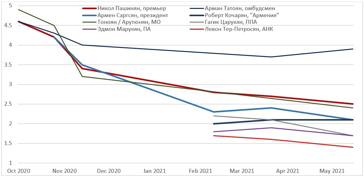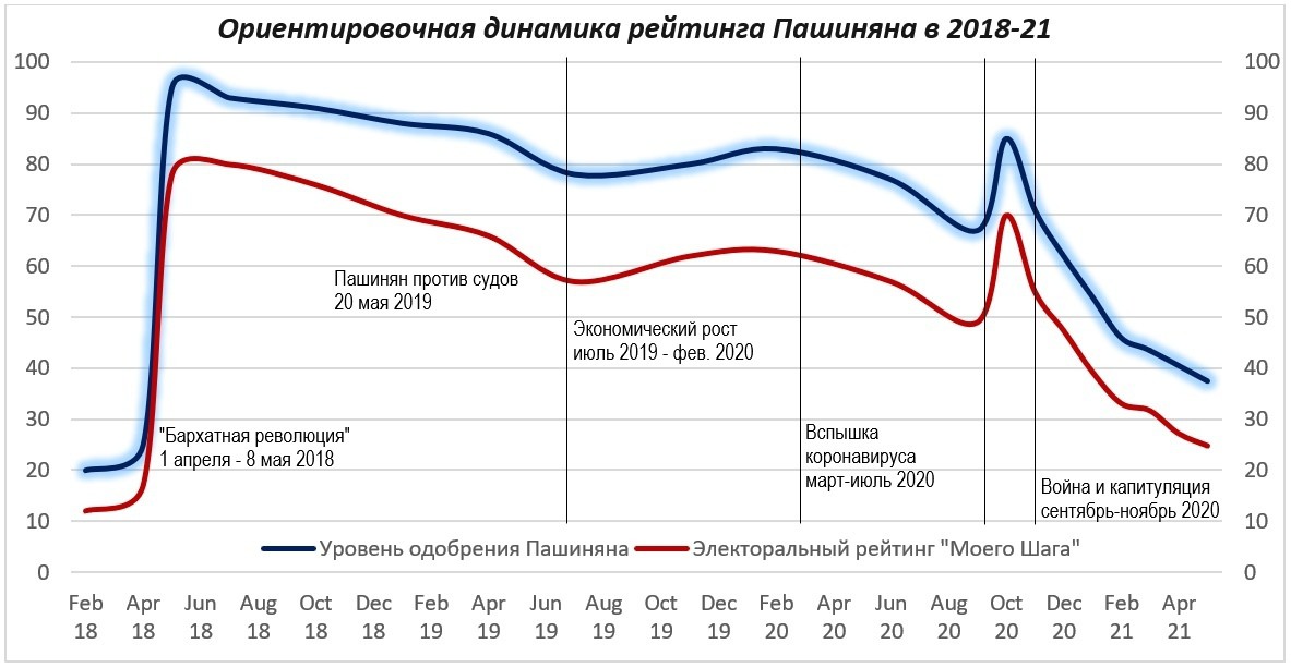 Естественно, нас больше всего интересует Пашинян. Поэтому представляю его рейтинг отдельно, опять же это обобщенная тенденция последних уже трех с половиной лет, с незначительными коррекциями относительно прошлых графиков.