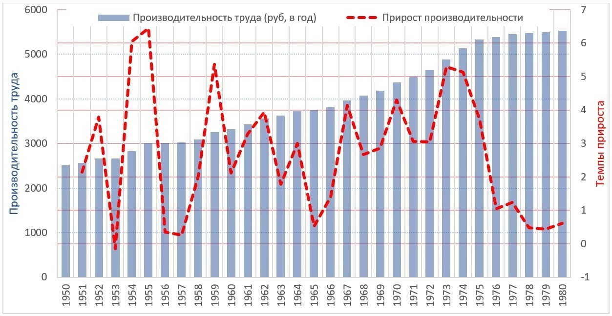 График 1. Производительность труда в промышленности (на одного рабочего за год, в постоянных ценах 1982 г.) и ежегодные темпы роста производительности труда в промышленности в послевоенном СССР