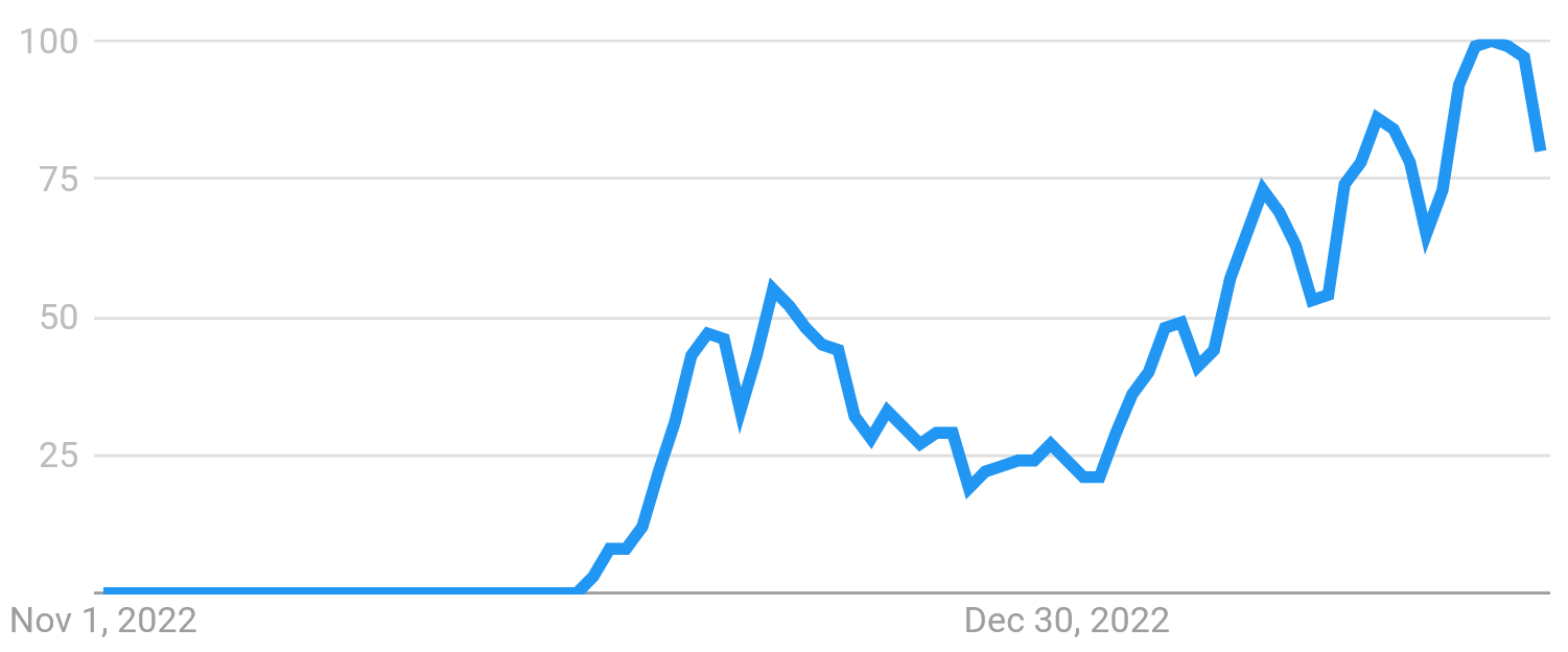 Понятно, что вирусный экспоненциальный рост не может продолжаться бесконечно – возможно, аудитория этого инструмента исчерпаема, хотя очень мобильна. Это может в принципе объяснить его быстрое распространение и последующее торможение, если оно случится. Судя по графикам Гугл-трендов, после первого скачка, последовавшего за запуском ИИ в конце ноября, произошла просадка интереса к чату, но она в основном относилась к периоду праздников, а дальше последовал устойчивый рост, с еженедельным проседанием на выходных (т.е. люди уже отчетливо используют ИИ для работы, а не развлечения).