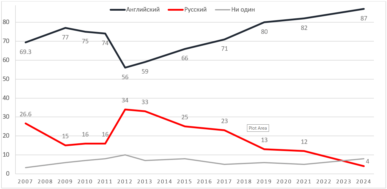 Взглянем на еще один показатель – предпочтение относительно преподавания иностранного языка. В последние годы общественное мнение уже стало тотально консолидированным по поводу необходимости преподавания английского языка. В 2024 году 87% предпочли английский и лишь 4% - русский.