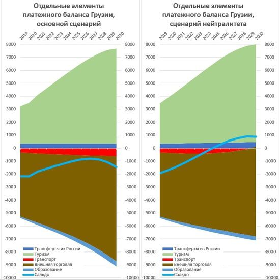 Подсчет показал, что ВВП Грузии сможет расти в год примерно на 1.1-1.3% быстрее в случае принятия нейтрального статуса, а к концу периода (2030) будет уже на 3-3.7 млрд долл. больше, чем при отсутствии нейтрального статуса. Также, вырастут доходы бюджета и сократятся расходы. Предположительно, Грузия станет получать меньше доходов от грантов, в первую очередь со стороны США. Но в то же время, сократятся расходы на оборону. Они и так сокращаются, но сокращение будет более значительным и к концу периода достигнет 60 миллионов долларов в год. Грузия начнет занимать меньше денег, практически распрощается с бюджетным дефицитом и, соответственно, меньше будет выплачивать в виде процентов. Также, повысится ее кредитный рейтинг и на основании этого, даже те средства, которые она будет заимствовать, страна получит под более низкий процент. В итоге, к 2030 году изменение доходов бюджета (рост экономики минус заимствование минус сокращение по грантам) будет уже достаточно значительным. В 2030 году доходы бюджета Грузии могут оказаться на 508 миллионов долларов больше основного сценария с неизменной внешней политикой. Также, сократятся расходы государственного бюджета – сокращение это произойдет за счет выплат долгов и процентов, а также военных расходов. К 2030 году эта разница достигнет 205 миллионов долларов. Таким образом, баланс расходов и доходов бюджета Грузии улучшится на 713 миллионов долларов. Это в свою очередь означает больше расходов на социальную, транспортную и коммунальную инфраструктуру страны, а также, больше инвестиций в экономику и дополнительное ускорение экономического роста.
