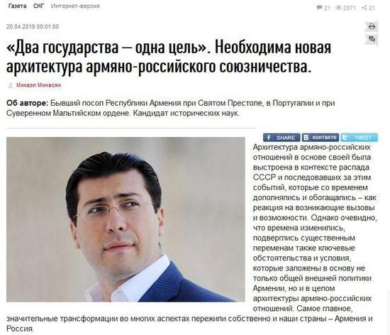 Статья Микаела Минасяна: Будущее армянской внешней политики и российско-армянского союза