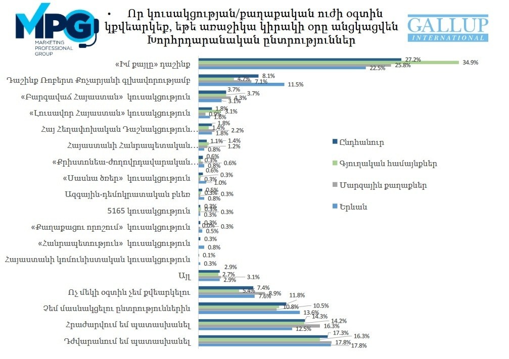 Таким образом, в дихотомии «революция / контрреволюция», оппозиция ставит на второе. Это не означает, что главой государства вновь станет Серж Саргсян (это представить себе невозможно), также это не значит, что ситуация в стране станет такой же как была до апреля 2018 года (это тоже невозможно), также это не означает, что сформируется коалиция из тех же сил, что были влиятельными в прошлом – в списке оппозиционных партий помимо республиканцев и сил, так или иначе связанных с ними, много других политических групп, в том числе новых. Но принципиальным изменением в случае победы оппозиции станет то, что закончатся попытки трансформации общества в том направлении, как это пытался сделать Пашинян, и возьмет верх более традиционная политика. Также, с большой вероятностью, будет прекращено внешнее влияние на общественно-политическую повестку страны, вырастет средний возраст представителей власти и политика будет более рассчитанной и осторожной. Оппозиция могла бы попытаться организовать против нынешней власти революцию, но это предполагает другие личностные качества людей, вовлеченных в политику, а также, предполагает постоянную информационную вовлеченность после революции, чего также оппозиция пытается избежать.