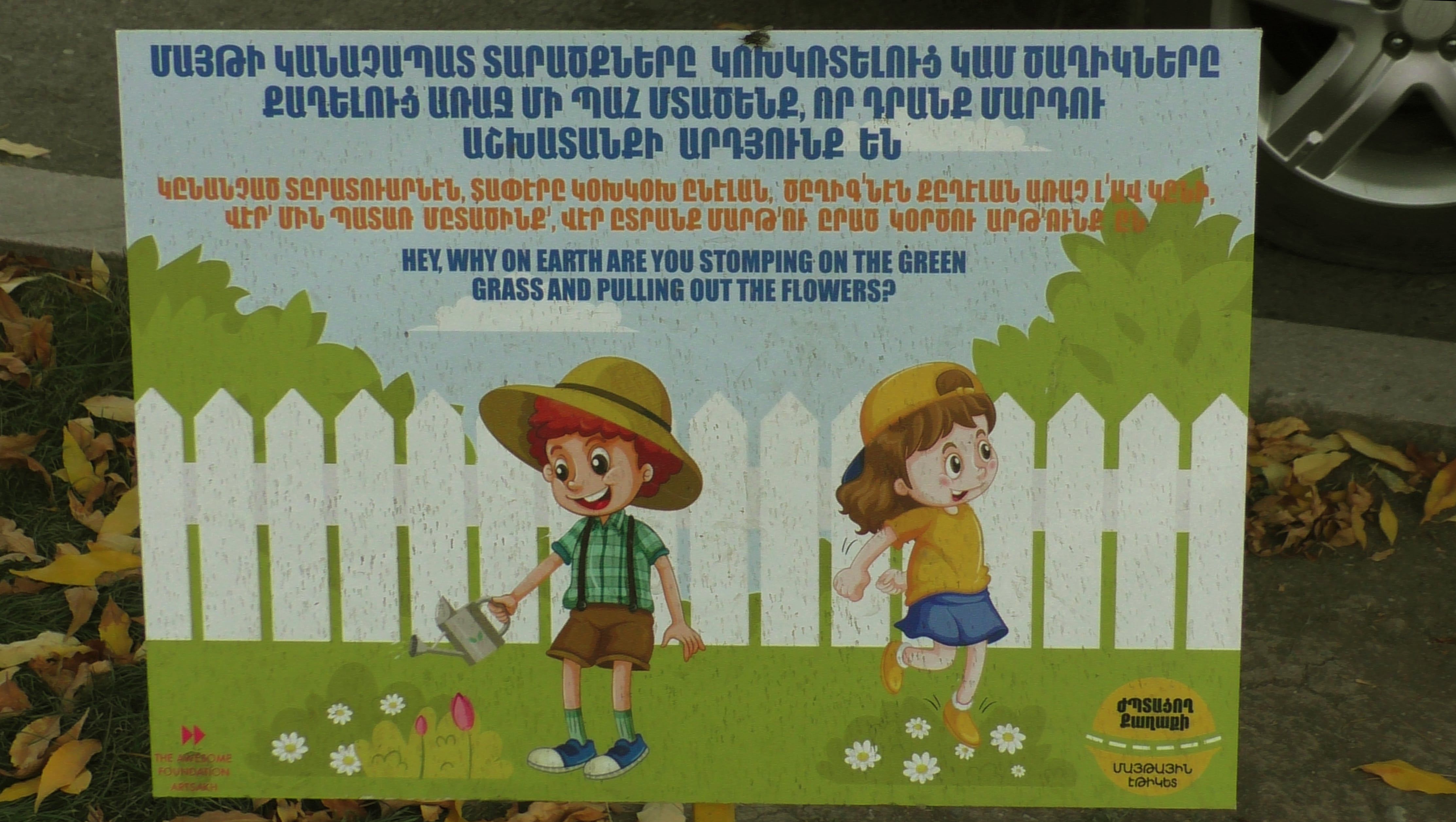 Составители этих табличек нашли оригинальное решение, под армянским текстом идет надпись на арцахском диалекте, видимо, чтобы читателя улыбнуло, это же Степанакерт. Ну и то же самое написано на английском языке. Почему не вставили текст и на русском, я не знаю. Рассмотрим эти таблички, а я переведу надписи, чтобы легче понималась картинка.