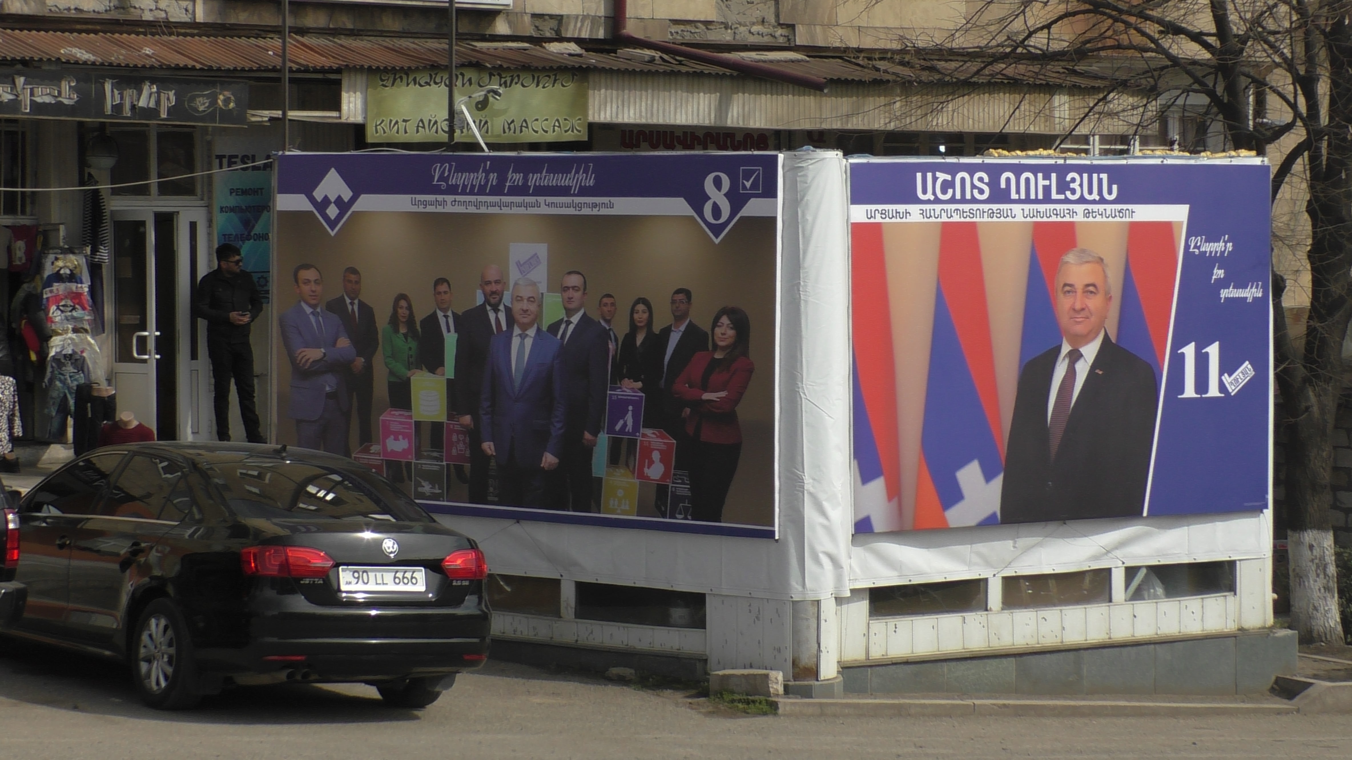 Больше всех денег у Араика Арутюняна, соответственно его плакат самый большой. Это рядом с вокзалом. Наши таксисты в своем большинстве за него, верят, что он станет президентом и улучшит жизнь всех жителей Арцаха. Интересно, если вдруг станет президентом, вспомнит ли о таксистах?