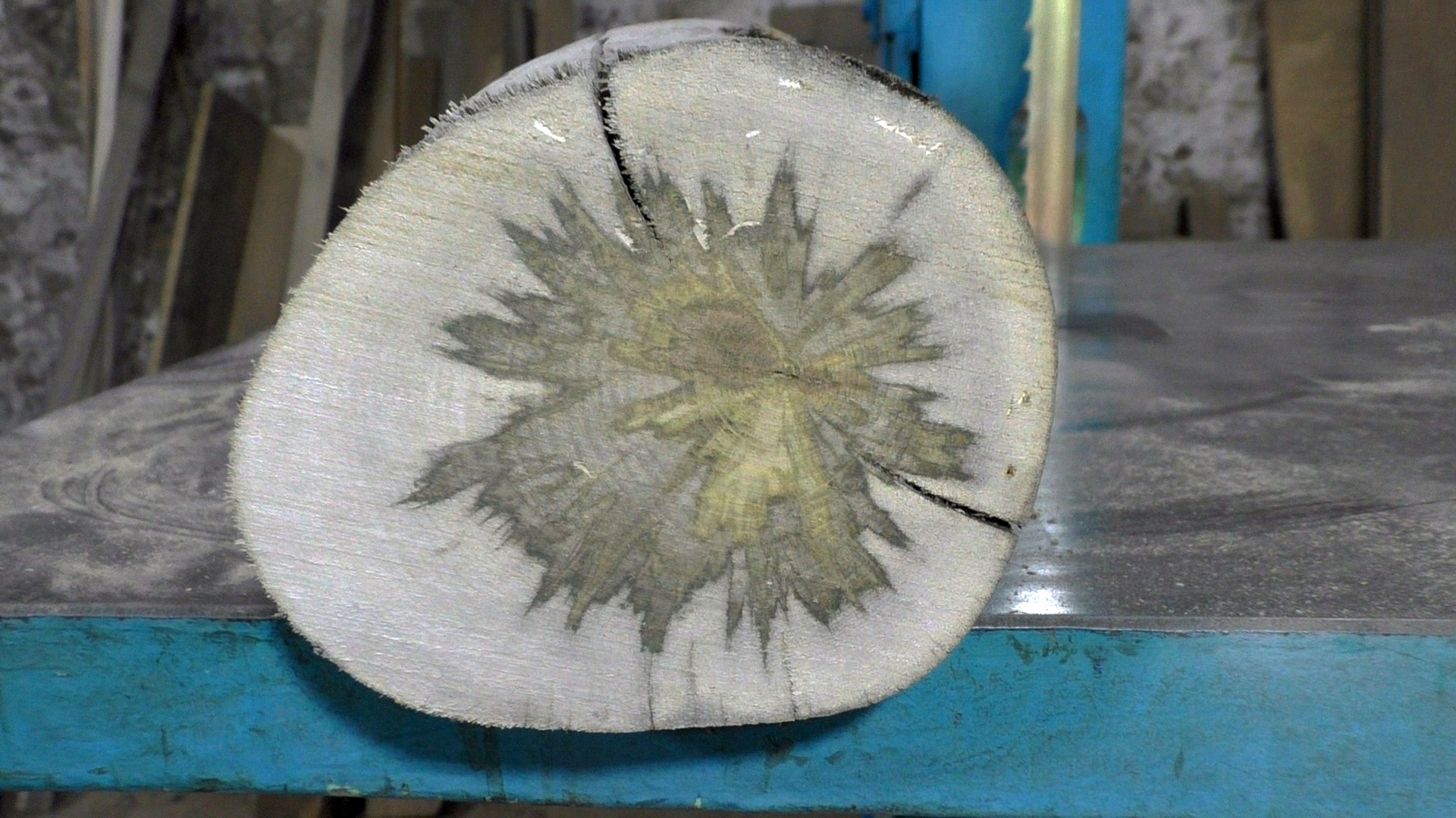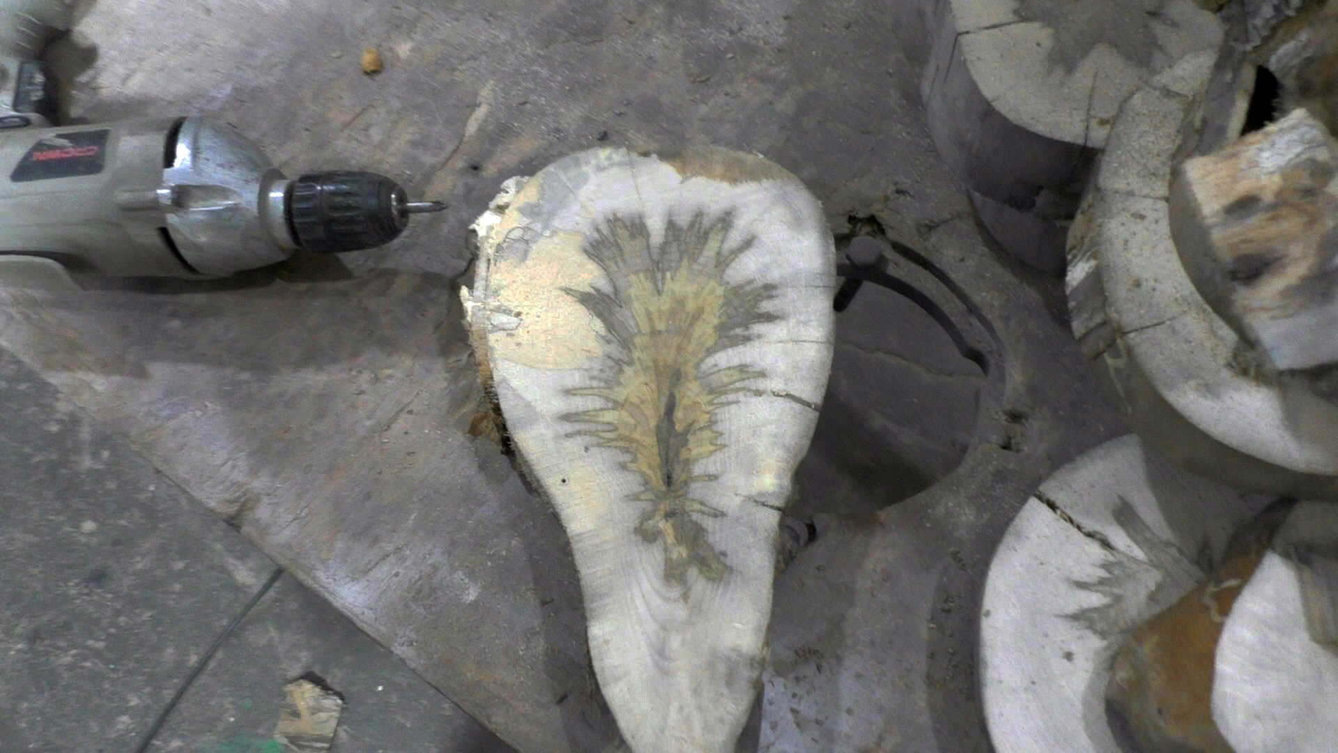 Дефект был в том, что разрез бензопилы получался неровным, поэтому другую половину разрезал надвое и привез домой, чтобы потом уже, аккуратно разрезать на станке. Жаль такую красоту сжигать, а это потом растянулось почти на три года.