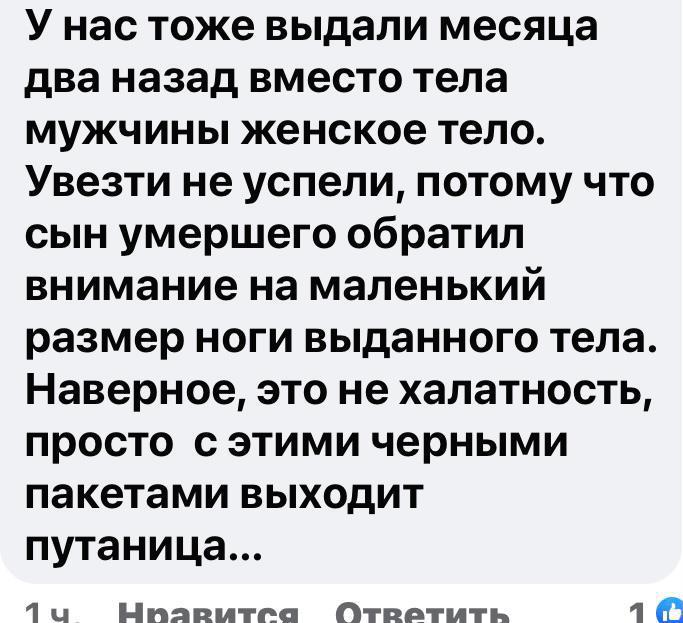 Под сообщением пользователь из КБР сообщил о подобной ошибке у нас, только в этом случае вместо тела мужчины в пакете оказалось женское тело. Еще один пользователь написал о том, что ему известны два случая, когда перепутали тела.