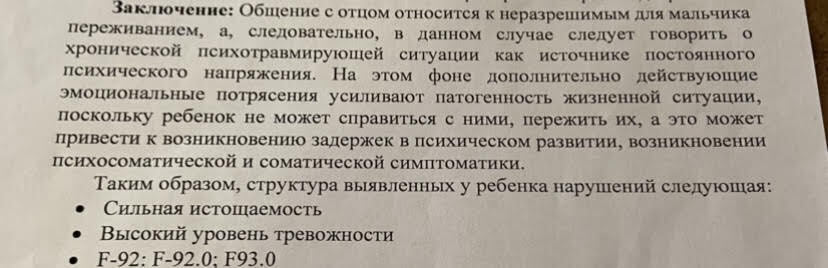 Заключение психолога подтверждает наличие у мальчика переживаний, связанных с отцом. Имеется также направление невропатолога на лечение ребенка в реабилитационном отделении.