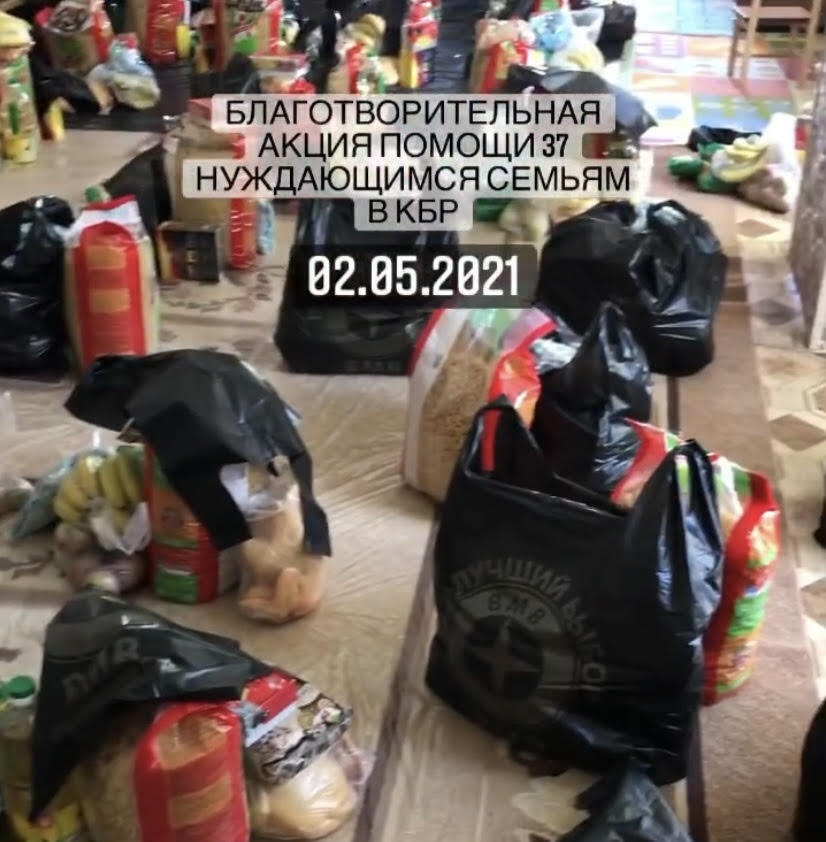 Президент фонда «Кавказ Нур» Ислам Арипшев (296 тысяч подписчиков) сообщил, что за время Рамадана фондом оказана помощь продуктовыми наборами 255 нуждающимся семьям. В пакеты включен стандартный набор продуктов первой необходимости, такие, как мука, сахар, чай, крупы, масло, а также сладости, фрукты, на 1500-2000 рублей по оптовым ценам. Иногда удавалось положить в пакеты мясо.