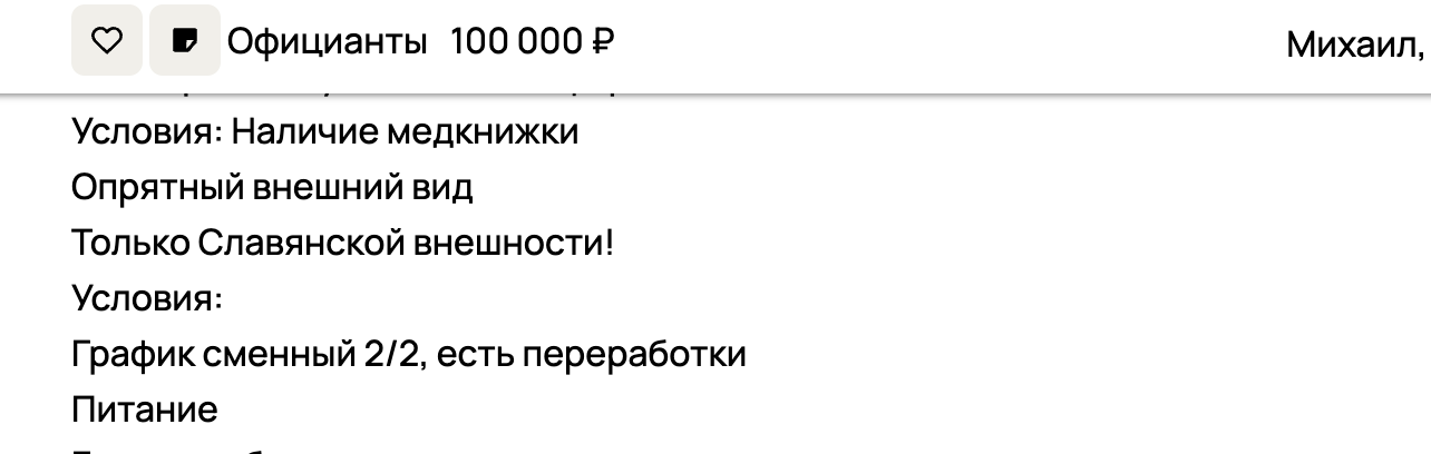 Объявления о работе, в которых есть пометка "только для славян", московский суд признал запрещенными из-за дискриминации по национальному признаку. Теперь такие формулировки, вроде как, влекут уголовную ответственность. Новость об этом появилась 15 января этого года.